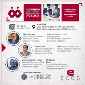 de amanhã, 27 até a segunda-feira, 30, no salão de convenções do Hotel Porto da Praia em Maceió (AL), o 2º Congresso Nacional para Extensão Pública numa realização da Ecos Consultoria, treinamentos e cursos. O tema do Congresso é “Uniformização dos recursos X Potencialidades locais” e ainda terá um mini curso que abordará a Formação legislativa: novo cenário político no âmbito da transparência legislativa, ministrado pelo advogado e procurador geral da Assembleia Legislativa de Alagoas, Diógenes Tenório Júnior. Com o tema “Reforma tributária: mudanças para o desenvolvimento e o crescimento de municípios e Estados”, terá a abordagem do deputado federal, bacharel em direito e PRF, Fábio Henrique. Já o deputado estadual (AL), agrônomo e historiador Inácio Loiola discorrerá sobre o tema “Políticas Públicas para o avanço e desenvolvimento de municípios e regiões.”