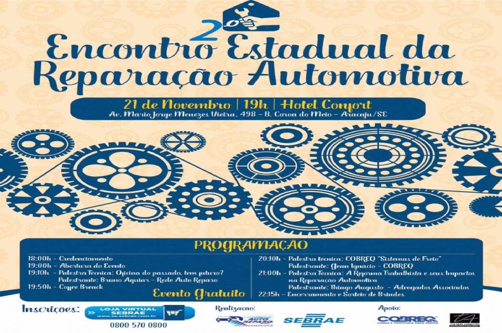 2º Encontro Estadual de Reparação Automotiva Na próxima terça-feira, 21, a partir das 19hs, no Hotel Confort (Coroa do Meio/Aracaju) será realizado 2º Encontro Estadual de Reparação Automotiva, com diversas palestras. O evento é uma promoção da Rede Auto Reparo com a o Sebrae/SE. O encontro discutirá temas pertinentes às mudanças na legislação com diversas palestras técnicas. Inscrições na loja virtual do Sebrae se.sebrae.com.br ou pelo 0800 570 0800.