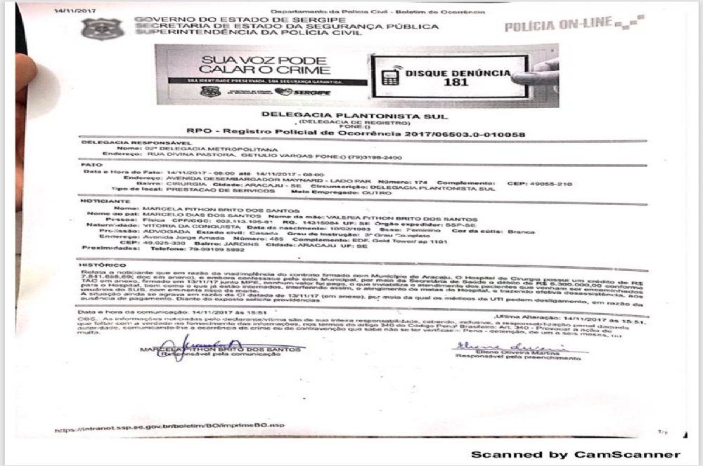 Hospital Cirurgia suspende cirurgias e presta BO assistencial em delegacia contra Secretária Municipal de Saúde de Aracaju.