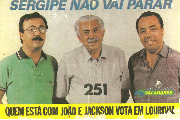 usuários, principalmente jovens começam a empunhar a bandeira dos seus candidatos prediletos e iniciam debater fervorosos chegando a brigar com amigos. Por isso, publica hoje um carta da campanha eleitoral do ano de 1986, onde Valadares e José Carlos Teixeira disputaram o governo estadual. Valadares venceu com o apoio de João e Jackson. No cartaz, Jackson e João Alves pedem votos para Lourival Batista que foi eleito senador. Na outra vaga foi eleito Francisco Rolemberg, como o apoio de José Carlos Teixeira e dos Francos. Os derrotados foram Viana de Assis (pela coligação de Valadares) e Seixas Dória (pela coligação de José Carlos Teixeira). Então, caros jovens, em Sergipe, quase todas as principais lideranças políticas já dividiram o mesmo palanque. A concepção ideologica foi para o espaço, os partidos se confundem e se fundem, literalmente. E os amigos, estes sim, quando verdadeiros, merecem a atenção eterna.