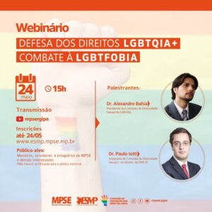 Hoje, 24, às 15h, Webinário no MPSE discutirá sobre os direitos LGBTQIA+ e o Combate à LGBTFobia O Ministério Público de Sergipe, por meio da Escola Superior (ESMP) e da Comissão dos Direitos de Lésbicas, Gays, Bissexuais, Travestis, Transexuais e Transgêneros, realizará hoje, 24, a partir das 15h, o Webinário com o tema “Defesa dos Direitos LGBTQIA+ e o Combate à LGBTFobia”. O evento é especialmente destinado aos membros, servidores e estagiários do MPSE, mas aberto também à participação de todos os interessados. A transmissão será feita por meio do canal do MPSE no YouTube.