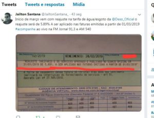 www.twitter.com/JailtonSantana_ Início de março vem com reajuste na tarifa de água/esgoto da @Deso_Oficial o reajuste será de 5,89% A ser aplicado nas faturas emitidas a partir de 01/03/2019.