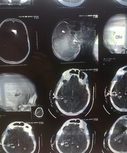 Luiz Mendonça, foi levado à Unidade de Tratamento Intensivo (UTI) do Huse onde está sendo mantido em coma induzido. No primeiro exame feito pela equipe de neurocirurgia, o paciente encontrava-se sedado, entubado, acoplado à ventilação mecânica e em coma. Havia ferimento penetrante do crânio em região parietal e transfixante em mão esquerda. O quadro clínico do paciente era grave com sinais de sofrimento encefálico. Ele foi imediatamente encaminhado ao centro cirúrgico para descompressão do crânio e correção das lesões decorrentes do ferimento penetrante. Até ontem, 18 à noite, o paciente mantém-se em estado grave.(Infonet).Ao lado uma das tomografias do crânio do motorista.