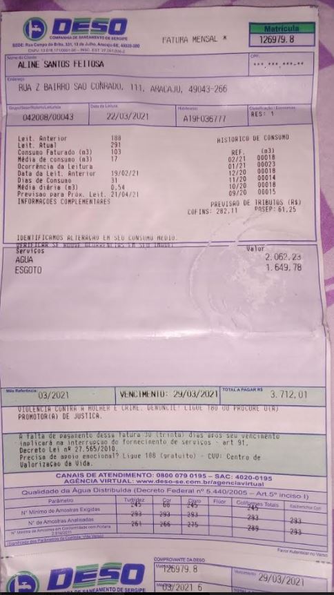 valores de R$ 180,00 a R$ 300,00 e a mais recente no valor de R$ 3,7 mil. Consumidora foi no CEAC e sem nenhuma explicação técnica ofereceram um acordo de R$ 1.200. Vai parar na Justiça! Do advogado Clarkson Moura: “Peço para usar este espaço para divulgar uma extorsão descarada da Deso contra uma pobre e indefesa usuária dos seus péssimos e custosos serviços básicos de necessidade pública: Aline Santos Feitosa. A aludida usuária, solteira, empregada assalariada da rede de supermercado GBarbosa, na qualidade de operadora de caixa — diga-se de passagem, só está em casa à noite, para dormir, pois passa o resto do dia na loja onde trabalha — única ocupante do imóvel caracterizado nas cópias das faturas anexas (bairro São Conrado), de baixíssima faixa de consumo d’água, ou seja, de tarifa social da empresa, tem recebido valores abusivos mensais, entre R$ 180,00 a R$ 300,00, constantes da sua conta de suposto e exorbitante consumo do precioso líquido e da consequente taxa de esgoto, conforme fazem prova as mesmas cópias anexas. Não bastasse a presumível extorsão reiterada, ela acaba de receber uma fatura com o valor surreal, absurdo e injustificável de R$ 3.712,01, com vencimento para 29/03/2021 (hoje). Pela a relevância e recorrência do caso, bem como pela hipossuficiência da indefesa, modesta e desesperada usuária, manifestamente lesada por essa useira e vezeira empresa pública de nosso estado, uma vez instado pela cidadã a ajudá-la, ousei apelar, no mais alto sentido ético-social, para o manifesto espírito profissional do amigo e jornalista e para a notória finalidade de utilidade pública desse veículo de comunicação de massa.” Logo após Clarkson Moura enviou uma proposta de acordo feito no posto da DESO no CEAC, no valor de R$ 1.200,00 sem nenhuma explicação técnica para a consumidora. Ou seja: será um caso de extorsão explicita. Agora vai parar na Justiça.
