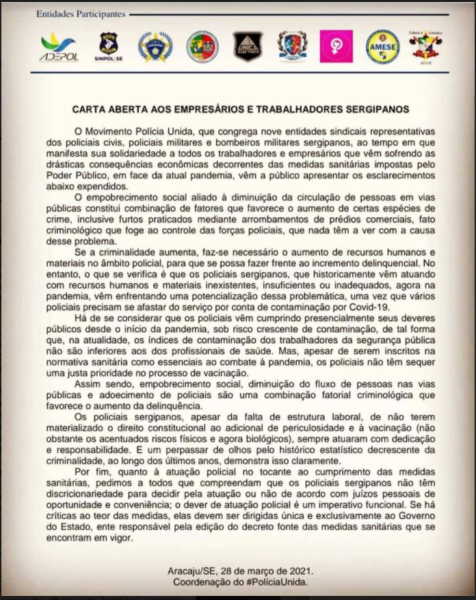 Nota – Fiscalização das medidas restritivas (Ascom/Semdec) Durante a operação realizada na faixa litorânea, nos dias 27 e 28, não foram identificadas práticas esportivas coletivas. Também não houve registro, nos canais oficiais de atendimento dos órgãos operacionais, de qualquer denúncia referente à situação mencionada. Para a comunicação de situações que estejam em desconformidade com os decretos do Poder Executivo, é possível acionar a Guarda Municipal de Aracaju, através do úmero 153, ou a Polícia Militar de Sergipe por meio do canal 190. Todas as denúncias registradas são devidamente atendidas. Obs do blog: é preciso denúncia? Não disseram que fiscalizariam toda a praia? E em frente aos lagos não é praia? Coincidência um jogo de futebol com times fardados em pleno domingo pela manhã, logo cedo, com policial no meio e não passarem por lá. Domingo tem mais…