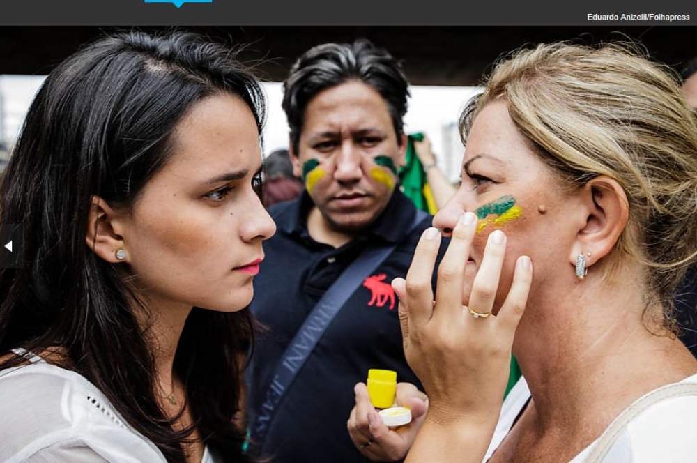 Primeira-dama de Propriá sendo pintada no rosto por uma das filhas na Av. Paulista em SP. (FSP/Eduardo Anizelli) |