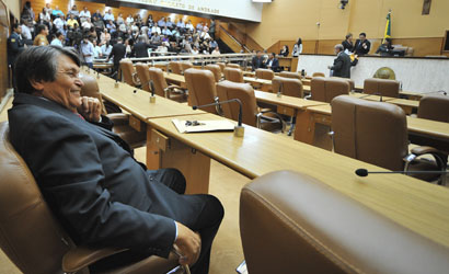 Falcão, do DEM, que foi deputado por várias legislaturas e presidente daquele poder. Ontem, 04, para tomar posse ele literalmente, “madrugou” no plenário. Como se dissesse: “farinha pouca, meu pirão primeiro”. E tomou posse do mandato. A foto é do repórter fotográfico César de Oliveira.