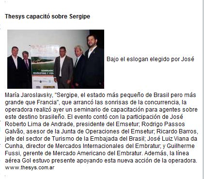 viagens de Buenos Aires foi destaque ontem numa das principais revistas de turismo do país, a Rèport Al Dia. Este treinamento faz parte da estratégia da Emsetur de retornar a promoção no mercado argentino. Inicialmente será feito um trabalho de informação do destino. No final de novembro estaremos recebendo 10 jornalistas argentinos.A meta é receber até maio, 500 turistas argentinos e ampliar este número no segundo semestre. Diferente do que foi feito no passado, o projeto e de longo prazo. “Estamos tomando cuidado com a qualidade no atendimento ao turista para que Sergipe se destaque como destino de qualidade no nordeste”, disse o presidente da Emsetur, José Roberto.