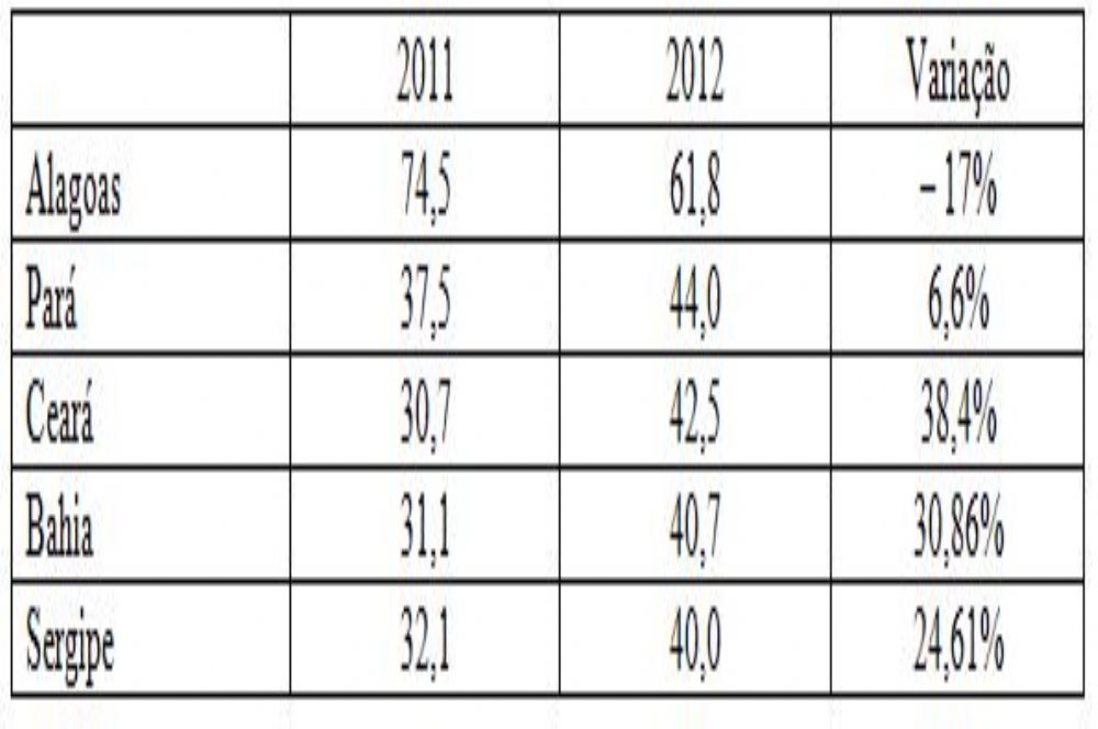 homicídios. Alagoas, com 61,8 casos por 100 mil habitantes, apesar de estar no primeiro lugar no ranking, registrou redução nos índices. Pará subiu para a segunda colocação, com 44 por 100 mil, seguido por Ceará (42,5), Bahia (40,7) e Sergipe (40). É preciso lembrar que em 2011 a taxa em Sergipe estava em 32,1 homicídios por 100 mil habitantes, isso representa um aumento de 24,6 % nos índices de homicídio.
