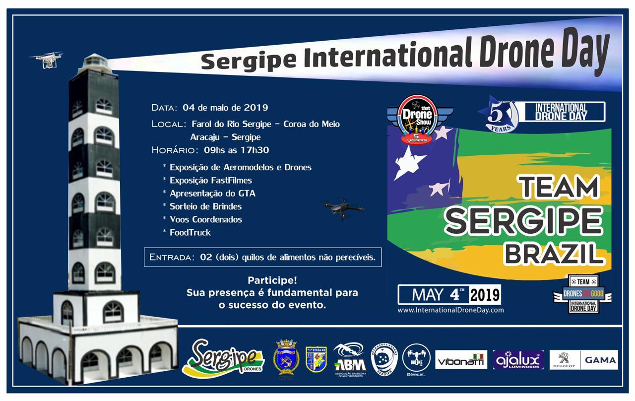 International Drone Day – Sergipe Neste sábado (04), o Sergipe Drones em parceria com a Marinha do Brasil e apoio do Destacamento de Controle do Espaço Aéreo (DTCEA-AR) da Força Aérea Brasileira, estará realizando o International Drone Day – Sergipe. O evento acontecerá a partir das 09h no Farol da Coroa do Meio.Dentre as atrações, haverá exposição de aeronaves multirrotores de diversos tipos e tamanhos, amadores e profissionais, voos coordenados de Drones, mini trio, show de helimodelismo e apresentação do Grupamento Tático Aéreo.