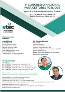 pela Etec E a empresa Etec Treinamento e Capacitações vem se destacando com a realização de eventos programados realmente para atender as necessidades dos gestores. Recentemente realizou o 7º Congresso com o tema “Desenvolvimento x Recursos Federais”, que reuniu dezenas de gestores tendo como palestrantes o deputado federal Fábio Henrique e o Procurador do Ministério público de Alagoas Ricardo Schneider. Para este mês de maio o 8º Congresso para gestores terá o tema “Organização Político – Administrativa Brasileira”, tendo como palestrantes o ex-deputado federal e ex-líder do governo federal, André Moura que falará sobre o novo Pacto Federativo. Já o advogado, mestre em direito público e doutorando em direito e novas tecnologias pela PUCRS, , Gustavo Ferreira ministrará sobre o tema controle judicial do processo legislativo municipal. O evento será de 24 á 27 de maio de 2019 em Maceió (AL). Informações: (79) 99859 – 8847/ (79) 98823 – 1414, ou pelo e-mail: contato@etec-treinamento.com.br