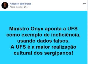 Em relação às declarações feitas pelo ministro da Casa Civil, Onyx Lorenzoni, a Universidade Federal de Sergipe (UFS) esclarece que possui 54 programas de Pós-Graduação, quatro deles com nota 5 pela Capes. Aproximadamente 90% dos alunos de mestrado (1.511) e doutorado (724) do estado de Sergipe são da UFS. O número de programas de pós-graduação da UFS saiu de 10 em 2007 para 54 em 2018, um crescimento de 440%.