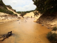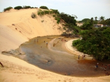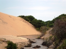 O rio forma uma curva desenhando ainda mais a beleza da região. É por uma caminhada de pouco mais de duas horas, beirando uma séria de dunas que se tem a impressão de estar em regiões bem mais famosas, como as de Natal ou Fortaleza, apesar da pouca estrutura turística da paisagem sergipana. Como as dunas famosas das regiões descritas, paredões de areia também viram escorregadores até as águas do riacho, tendo quem pratique sandboard e skibund, surfe na areia realizado por meio de uma prancha simples.