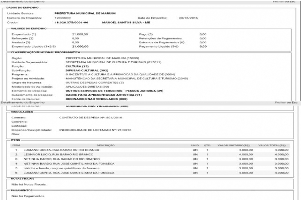 passado foi dito pelo poder público municipal que não seria realizada festa da virada do ano, pois a situação financeira do município não era nada boa, devido a crise, salários atrasados e etc, até mesmo seguindo determinação do TCE para não realizar festa nas cidades com atrasos de salários(até tudo bem,excelente iniciativa,nada a questionar).Porem eis que no começo do mês surge uma nota de empenho no portal da transparência que constando o valor de R$ 21.000,00 para pagamentos de cachês de artistas(todos da cidade) em duas ruas da cidade.Detalhe: as festas foram particulares, como foi amplamente divulgado, organizadas pelos moradores, havendo até coleta da famosa cotinha para realização e organização, sendo que a festa da rua barão do Rio Branco(conhecida popularmente por rua dos correios,como consta na especificação do empenho) é a rua que mora os familiares da primeira dama da cida, sogro e sogra do prefeito, ou seja, todo mundo pensando que a festa "particular" foi bancada pelos próprios moradores, mas aparece o empenho mostrando que a tal festa na verdade foi realizada com dinheiro público, R$ 21.000,00 para ser mais exato, um absurdo, bancar farra de terceiros e familiares do gestor com o nosso dinheiro.Estou enviando em anexo a nota de empenho, peço sigilo e agradeço mais uma vez, só temos a imprensa para recorrer para que casos como esse não se repitam,obrigado.”