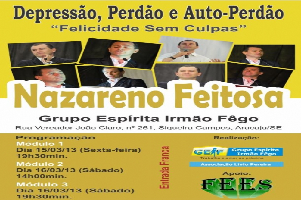 tema principal. O evento será realizado nos dias 15 e 16 de março (ao todo são três módulos), no Grupo Espírita Irmão Fêgo (Rua Vereador João Claro, 261, Bairro Siqueira Campos, Aju), O evento conta com o apoio da Federação Espírita de Sergipe e é uma realização do Grupo Espírita Irmão Fêgo e da Associação Lívio Pereira. Entrada Franca.Informações: www.fees.org.br