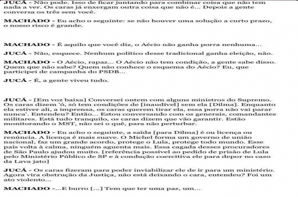 | O ministro do Planejamento, senador licenciado Romero Jucá (PMDB-RR), sugeriu ao ex-presidente da Transpetro Sérgio Machado que uma "mudança" no governo federal resultaria em um pacto para "estancar a sangria" representada pela Operação Lava Jato, que investiga ambos: http://www1.folha.uol.com.br/poder/2016/05/1774018-em-dialogos-gravados-juca-fala-em-pacto-para-deter-avanco-da-lava-jato.shtml |