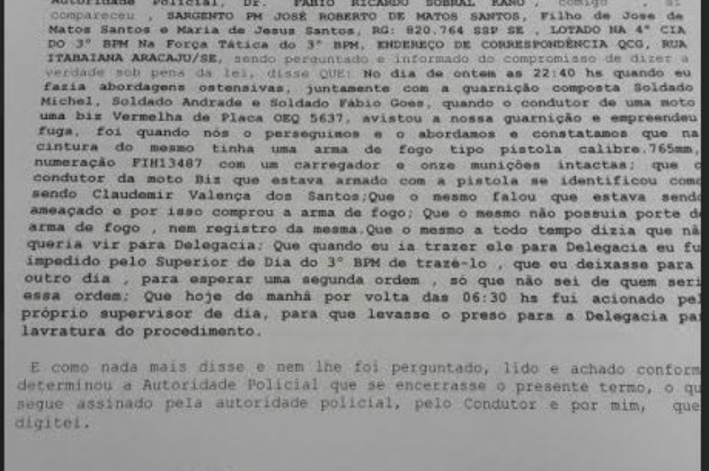 | O auto de flagrante com o relato feito pelo Sargento da PMSE. Estranho a decisão do superior que não deixou levar o preso para a delegacia na mesma noite. |