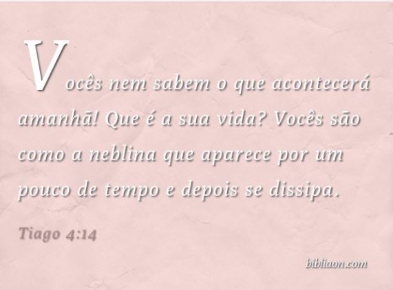 “Não sabeis o que acontecerá amanhã! Pois que é a vossa vida? Sois um vapor que aparece por um instante e depois se desvanece.” São Tiago sobre a vida epístola 4:14.