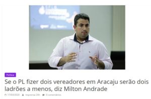 dois ladrões a menos” na Câmara é uma grave acusação generalizada O titular deste espaço sempre teve Milton Andrade, que foi candidato a prefeito de Aracaju em 2016, como um político sensato e equilibrado. Este ano, por conta das mudanças partidárias, está mudado e alterado. Filiado agora ao PR, partido comandado por Edvan Amorim em Sergipe, Milton Andrade é o presidente em Aracaju e ontem, 17, ao conceder entrevista ao Jornal da Manhã (rádio Jovem Pan Aracaju, leia aqui), disse que se o PL fizer dois vereadores serão duas pessoas qualificadas e “dois ladrões a menos” na Câmara.
