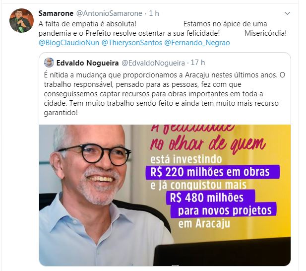 www.twitter.com/AntonioSamarone A falta de empatia é absoluta! Estamos no ápice de uma pandemia e o Prefeito resolve ostentar a sua felicidade! Misericórdia!
