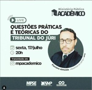 Live hoje, 17/07, às 20h “Questões práticas e teóricas do Tribunal do Júri” Hoje, 17, ás 20h, será realizada mais uma live do MP Acadêmico, com a participação do promotor de Justiça, Flaviano Almeida, apresentando importantes questões teóricas e práticas sobre o Tribunal do Júri. Aqui: