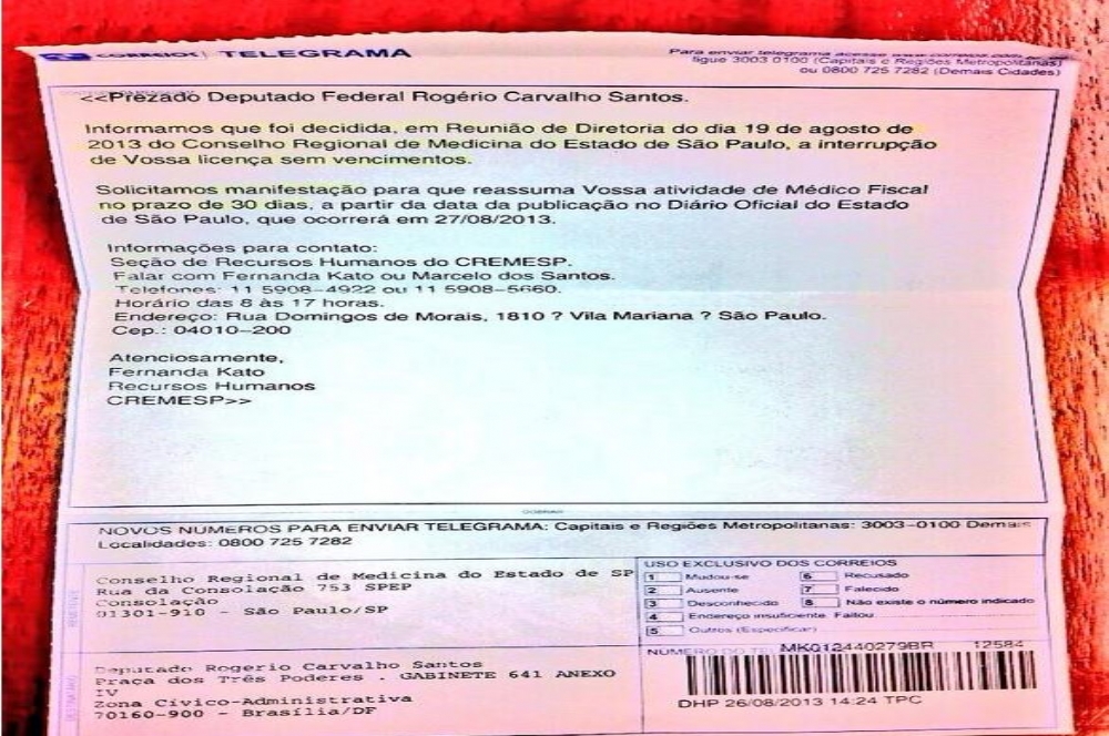 Telegrama do Conselho Medicina SP: assédio moral a Rogério Carvalho |