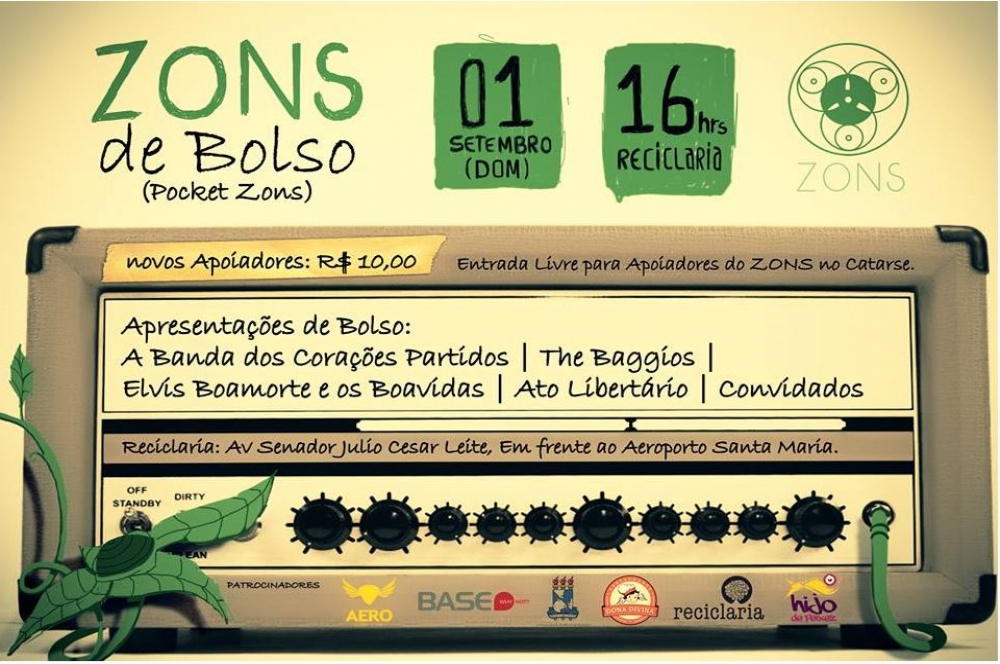O Zons está com um projeto de captação de apoio para o DVD do festival, na plataforma virtual Catarse (http://catarse.me/pt/zons )Durante o evento Pocket Zons, a equipe estará com computadores conectados, onde o público poderá comprar cotas e fazer o pagamento com cartões de crédito/débito e em espécie.Entrada Livre para Apoiadores do ZONS no Catarse.Tanto os que já compraram alguma cota como também os que irão comprar alguma cota no dia do evento (1 de setembro).As pessoas que já apoiaram estarão na lista de convidados, na entrada do evento.Acesso a novos Apoiadores: R$ 10,00. Reciclaria: Av Senador Julio Cesar Leite, Em frente ao Aeroporto Santa Maria.Contatos: (79)8853-5269/ (79)8816-0686.
