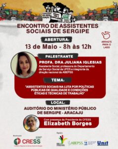 Região (CRESS Sergipe), terá início nesta sexta-feira (13), em Aracaju, no Auditório do Ministério Público de Sergipe. Com o tema “Assistentes Sociais na luta por políticas públicas de qualidade e condições éticas e técnicas de trabalho”, o encontro faz parte da programação em comemoração ao Dia do/a Assistente Social, celebrado no dia 15 de maio e acontecerá até o dia 31 de maio.