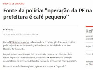 Notícias informou, a Procuradoria do Município de Aracaju decidiu pedir na Justiça a extinção do inquérito aberto na Polícia Federal sobre o Hospital de Campanha. Logo depois da manifestação da Procuradoria, nesta sexta-feira, 24, duas fontes da polícia, reservadamente, disseram a NE Notícias que a operação desencadeada na Secretaria de Saúde e na casa de servidores é “café pequeno”. Diante da insistência do repórter, apenas uma resposta: “aguarde”.