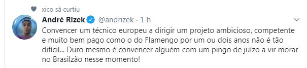 www.twitter.com/andrizek Convencer um técnico europeu a dirigir um projeto ambicioso, competente e muito bem pago como o do Flamengo por um ou dois anos não é tão difícil… Duro mesmo é convencer alguém com um pingo de juízo a vir morar no Brasilzão nesse momento!