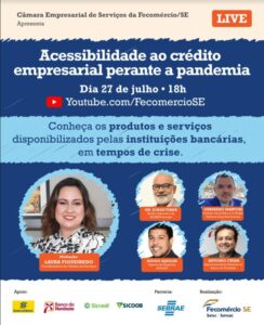 representantes de instituições bancárias dirão, para demonstrar os produtos e serviços, disponibilizados para as empresas neste período complicado por causa da Covid-19. A mediação será feita pela coordenadora da Câmara, Laura Figueiredo. Inscreva-se no canal da Fecomércio, no YouTube (https://www.youtube.com/user/FecomercioSE) e ative o sininho para receber a notificação. O evento tem o apoio do Banco do Brasil, Banco do Nordeste, Sicredi, Sicoob e a parceria do Sebrae.