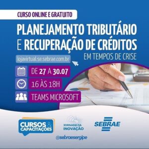 capacitar empresários e gestores de micro e pequenas empresas para tomada de decisão sobre regimes de tributação, alíquotas, bases de cálculo e recuperação de créditos tributários, o SEBRAE/SE estará realizando o Curso Planejamento Tributário e Recuperação de Créditos em momentos de crise. As inscrições são gratuitas, mas as vagas são limitadas. De 27 a 30/07/2020, das 16 às 18h. Plataforma Teams – Sebrae/Se. Inscrições: https://lojavirtual.se.sebrae.com.br/loja/evento/212000096