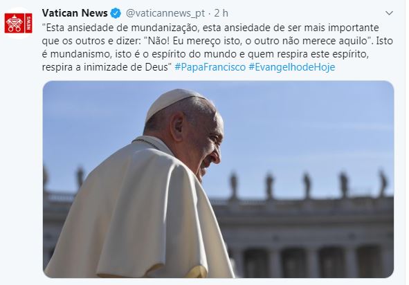 www.twitter.com/vaticannews_pt “Esta ansiedade de mundanização, esta ansiedade de ser mais importante que os outros e dizer: “Não! Eu mereço isto, o outro não merece aquilo”. Isto é mundanismo, isto é o espírito do mundo e quem respira este espírito, respira a inimizade de Deus” #PapaFrancisco #EvangelhodeHoje