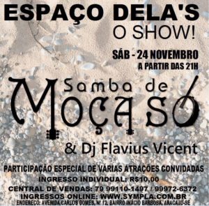 Espaço Delas: Samba de Moça Só comanda a Festa No sábado, 24 de novembro, a partir das 21h Aracaju será palco do show “Espaço Delas” sob o comando do renomado Grupo Samba de Moça Só. O show terá, ainda, a participação do Dj Flavius Vicent, dentre outras atrações que já se apresentaram no ESPAÇO DELA’S LOUNGE, até então. A festa marcará o encerramento das atividades do espaço, ponto efervescente de baladas alternativas, que seguirá com outro ramo de eventos. O espaço está situado à Avenida Carlos Gomes, nº 12, Bairro Inácio Barbosa.