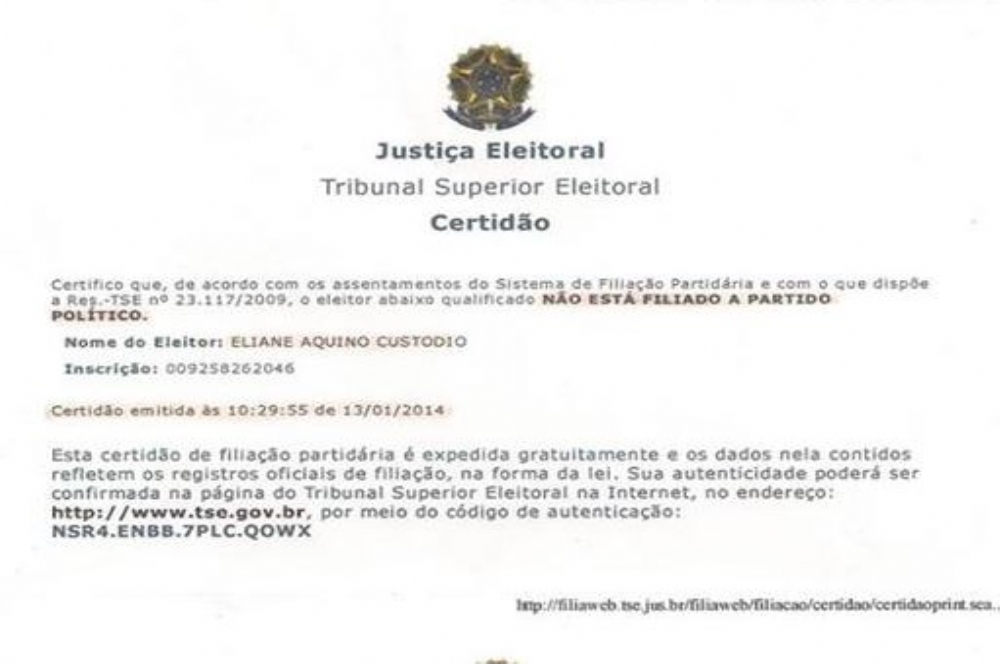 Eliane Aquino Custodio não está filiada a nenhum partido político. A certidão foi expedida pelo TSE, no último dia 13 de