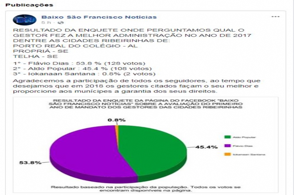 Administração de Propriá com míseros 2 votos em enquete O portal Baixo São Francisco Notícias fez uma enquete com os leitores sobre qual o melhor gestor administração de 2017, entre os três prefeitos das cidades ribeirinhas: Porto Real do Colégio (AL), Propriá e Telha, ambas de Sergipe. O resultado foi o seguinte: 1° – Flávio Dias, Telha : 53.8 % (128 votos);2° – Aldo Popular, Proto Real do Colégio: 45.4 % (108 votos) e 3° – Iokanaan Santana, Propriá : 0.8% (2 votos). Chamou a atenção que de mais de 200 votos o prefeito de Propriá teve apenas dois. Algo está errado na administração dele.