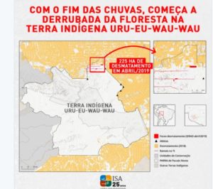 www.twitter.com/socioambiental Em abril, o equivalente a 225 campos de futebol foram desmatados na Terra Indígena Uru-Eu-Wau-Wau, em Rondônia. Uma invasão massiva de grileiros ocorre desde o final de 2018 e ameaça povos em situação de isolamento voluntário. Saiba mais.