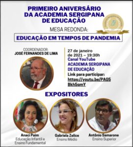 Primeiro Aniversário da Academia Sergipana de Educação Na próxima quarta-feira, 27, às 19h30, Mesa Redonda com o tema “Educação em Tempos de Pandemia.” A mesa será coordenada pelo professor José Fernandes de Lima tendo expositores: Anaci Paim, educação infantil e ensino fundamental; Gabriela Zelice, ensino médio e Antônio Samarone, ensino superior. Aqui: https://www.youtube.com/watch?v=PAG5Bkh5qmY