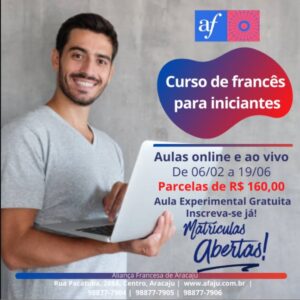 Curso de francês a partir de 06 de fevereiro O curso de francês para iniciantes da Aliança Francesa está com Matrículas Abertas, cujas aulas começam a partir de 6 de fevereiro, através de uma plataforma interativa, de forma online e ao vivo. Aproveite o valor promocional, escolha um horário e participe gratuitamente de uma aula experimental virtual de francês. Para mais informações, acesse www.afaju.com.br ou entre em contato conosco através do e-mail secretaria@afaju.com.br ou do Whatsapp 98877 7904 | 98877 7905 | 98877 7906.