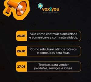 A forma como você se comunica está prestes a mudar de uma maneira que você nunca imaginou. Acesse o link: https://conteudos.vox2you.com.br/evento-de-oratoria-gratuito e inscreva-se na Semana do Orador, 3 palestras imperdíveis, gratuitas, a partir de hoje, 25 das 20h as 21h. Evento 100% online e gratuito; Acesso a conteúdos exclusivos da maior academia de oratória da América Latina; Interações ao vivo durante o evento; Bônus exclusivos para os participantes. Conheça mais as técnicas de oratória seguindo: https://www.instagram.com/vox2you.aju/