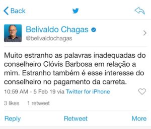 Chagas (veja print ao lado) que gera insinuação sobre interesse do conselheiro Clóvis Barbosa, ex-presidente do TCE-SE, lembra a música que diz assim: “Você pagou com traição, a quem sempre te deu a mão…” Ao deixar a presidência do órgão, Clóvis transferiu ao tesouro do Estado mais de 7 milhões de reais destinado a ações executivas em diversas secretarias. Dentre essas secretarias estava a da Saúde que foi comtemplada com mais de R$ 2 milhões para aquisição de uma carreta para tratamento oncológico. E com a carreata pronta o governador disse que não sabe onde está o dinheiro doado pelo TCE/SE.