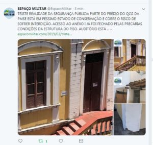 www.twitter.com/EspacoMilitar TRISTE REALIDADE DA SEGURANÇA PÚBLICA: PARTE DO PRÉDIO DO QCG DA PMSE ESTÁ EM PÉSSIMO ESTADO DE CONSERVAÇÃO E CORRE O RISCO DE SOFRER INTERDIÇÃO. ACESSO AO ANÉXO I JÁ FOI FECHADO PELAS PRECÁRIAS CONDIÇÕES DA ESTRUTURA DO PISO. Leia aqui.