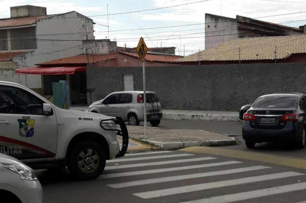 | o Nissan locado pela PMSE (placa QKX-3382) e a caminhonete do comando geral da PMSE (placa QKY-0673) na porta do colégio Modulo… |