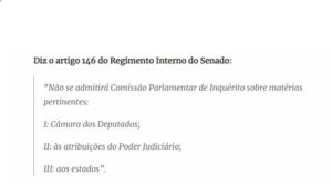 Toga” ou ainda “dos Tribunais Superiores”. Ora, se são os tribunais ou a magistratura superior que estão na mira do neófito Senador, não deixa de haver desrespeito ao Regimento Interno do Senado. No artigo 146 como citaram os jornalistas. (Veja print ao lado)