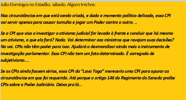 João Domingos no Estadão, sábado: “Nas circunstâncias em que está sendo criada, e dado o momento político delicado, essa CPI vai servir apenas para causar tumulto e jogar um Poder contra o outro. ..