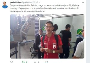 www.twitter.com/prefeitinho17 Corpo do jovem Athila Paixão, chega no aeroporto de Aracaju as 16h30 deste domingo. Segue para o povoado Brasília onde será velado e sepultado as 9h desta segunda feira no cemitério local.