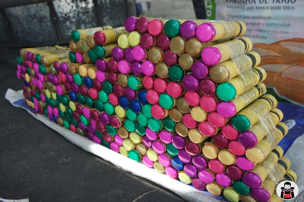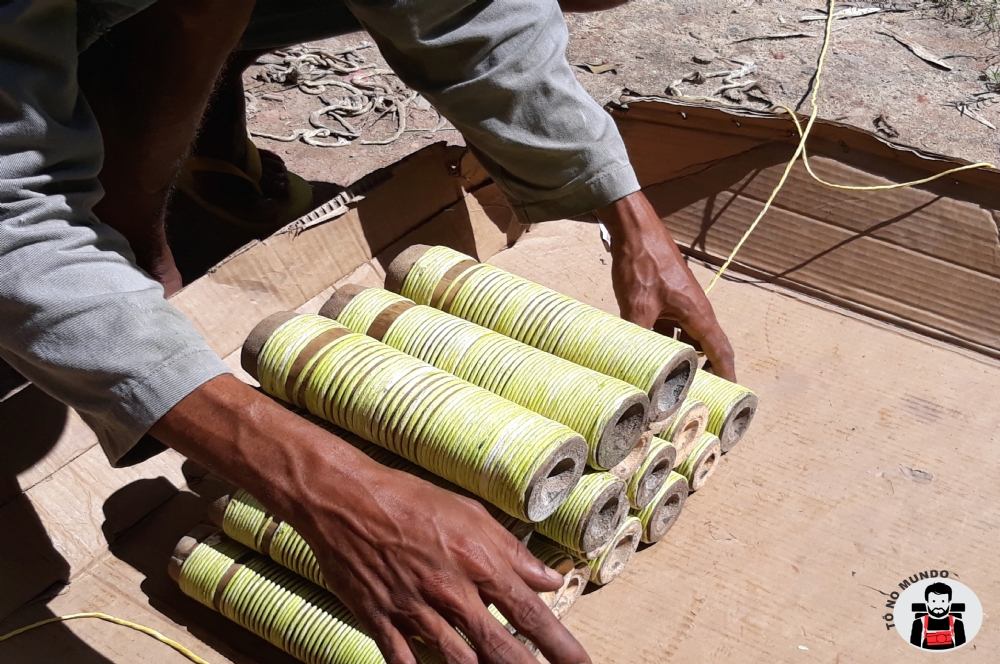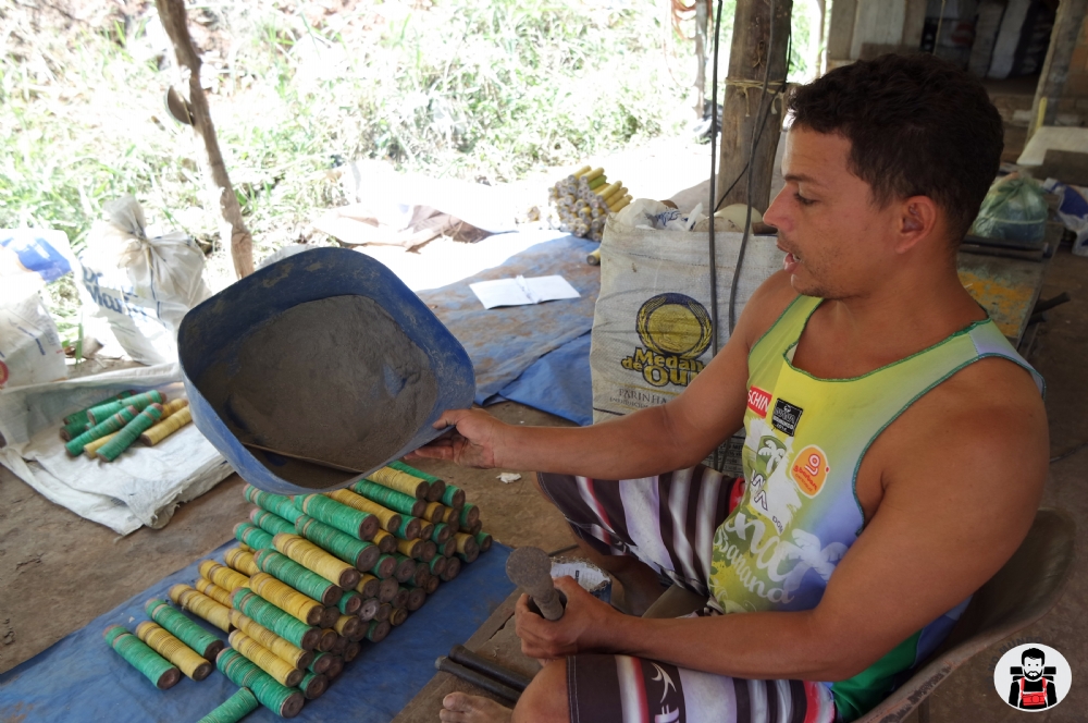 “Começamos a fabricar em novembro e já chegamos a produzir mais de 2 mil dúzias de espadas”, conta o fogueteiro Paulo Matocelle, sem deixar de pisar o barro que ocupará parte da bitola do bambu, juntamente com pólvora, limalha e cachaça. Isso mesmo, os fogueteiros utilizam a “branquinha” para selar a pólvora e o barro que comporá as espadas.