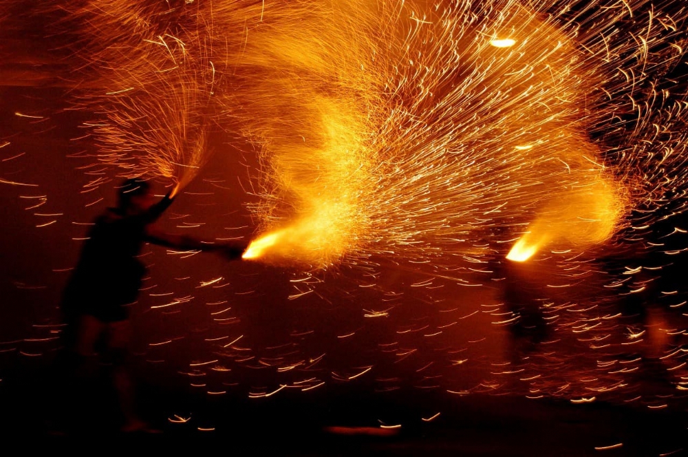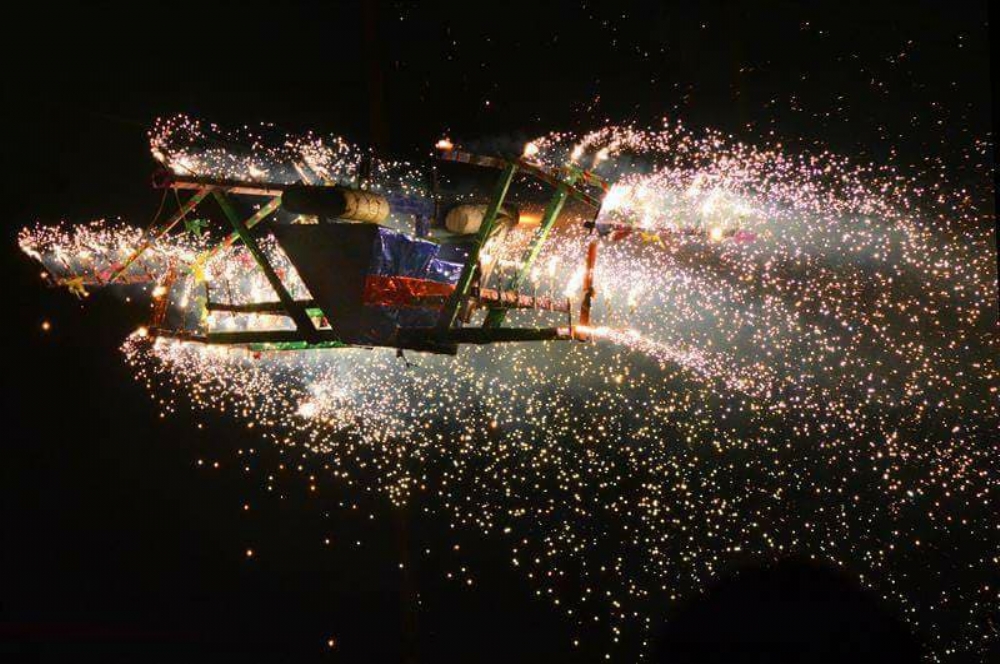 Um barco decorado com bandeirinhas e coloridas estampas percorre um fio de aço, e pela força de espadas de fogo, é tracionado até chegar ao final. Ao percorrer determinado percurso, os fogos de artifícios colocados no artefato promovem a tração inversa, fazendo com que o barco retorne.