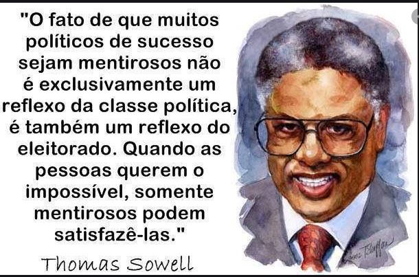 “O fato de que muitos políticos de sucesso são mentirosos, não é exclusivamente reflexo da classe politica, é também um reflexo do eleitorado. Quando as pessoas querem o impossível somente os mentirosos podem satisfazê-las.”’ Thomas Sowell.