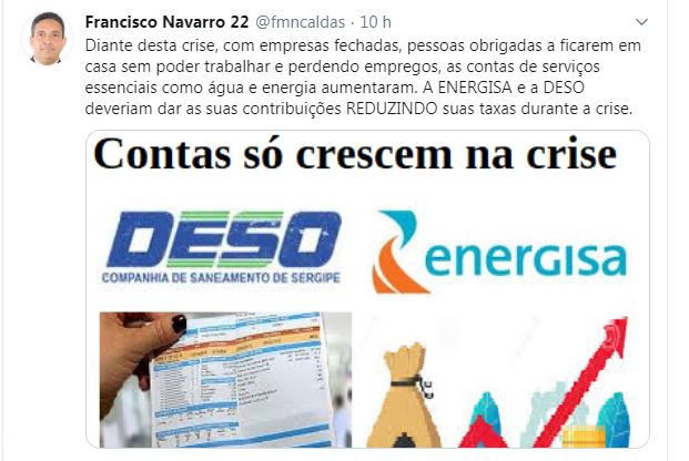 www.twitter.com/fmncaldas Diante desta crise, com empresas fechadas, pessoas obrigadas a ficarem em casa sem poder trabalhar e perdendo empregos, as contas de serviços essenciais como água e energia aumentaram. A ENERGISA e a DESO deveriam dar as suas contribuições REDUZINDO suas taxas durante a crise.
